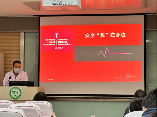 隨后,校醫(yī)院護士杜文麗向同學(xué)們講解了基礎(chǔ)的生命緊急事故急救方法,如心臟驟停、窒息、觸電等,并通過人體模型向在座師生展示了心肺復(fù)蘇、除顫儀和海姆立克急救法的具體操作。