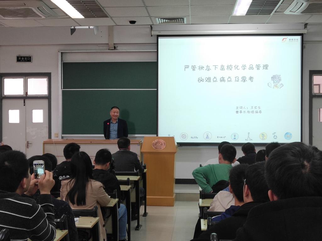 作為2019年安全文化周的重要活動之一,11月14日我院組織開展了危險(xiǎn)化學(xué)品安全知識講座及廢棄物泄漏應(yīng)急處置演練。本次活動參與的院系遍布全校,除化學(xué)院以外,還有材料學(xué)院、能源學(xué)院、光電學(xué)院、電氣學(xué)院、機(jī)械學(xué)院、物理學(xué)院、生命科學(xué)院、國光中心等涉及危險(xiǎn)化學(xué)品使用的單位的教師和學(xué)生代表約200人參加了本次培訓(xùn)。化學(xué)與化工學(xué)院副院長朱啟軍、實(shí)驗(yàn)室與設(shè)備管理處安全科科長朱菁萍以及安全科相關(guān)老師出席了培訓(xùn)會和應(yīng)急演練。