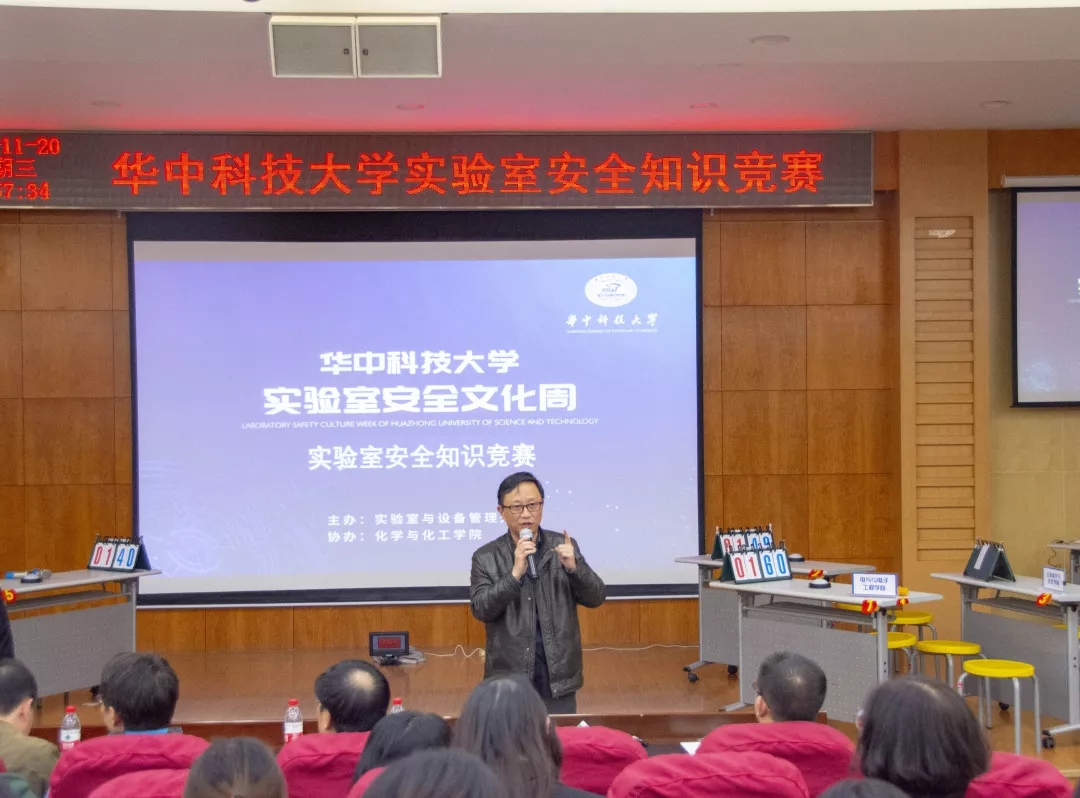11月20日晚六點(diǎn),華中科技大學(xué)實(shí)驗(yàn)室安全知識(shí)競(jìng)賽決賽于大學(xué)生活動(dòng)中心B座513成功舉辦。出席決賽的嘉賓有:實(shí)驗(yàn)室與設(shè)備管理處處長(zhǎng)李震彪,副處長(zhǎng)毛勇杰,化學(xué)與化工學(xué)院副院長(zhǎng)朱啟軍,以及實(shí)驗(yàn)室與設(shè)備管理處的老師們,其中仲裁席嘉賓由馮志力老師和楊春華老師擔(dān)任。