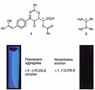 The researchers designed and synthesized a pair of chiral carboxylic acids, D- and L-1, that fluoresce only when they are aggregated. This unique aggregation-induced emission (AIE) attribute allows 1 to act as a chiral fluorescence sensor. For example, L-1 forms enantioselective aggregates with (1R,2S)-2 but not its enantiomeric congener (1S,2R)-2. As shown in the photos, aggregates of the L-1–(1R,2S)-2 complex are visibly fluorescent, but the solution of nonaggregated L-1 and (1S,2R)-2 is nonemissive.