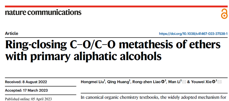 4月5日,化學(xué)與化工學(xué)院謝有偉研究團隊與廖榮臻教授合作的論文Ring-closing C–O/C–O Metathesis of Ethers with Primary Aliphatic Alcohols在《Nature Communications》刊發(fā)。博士生劉紅梅為該論文第一作者,謝有偉教授與李曼副教授為本文的共同通訊作者,華中科技大學(xué)為唯一通訊單位。