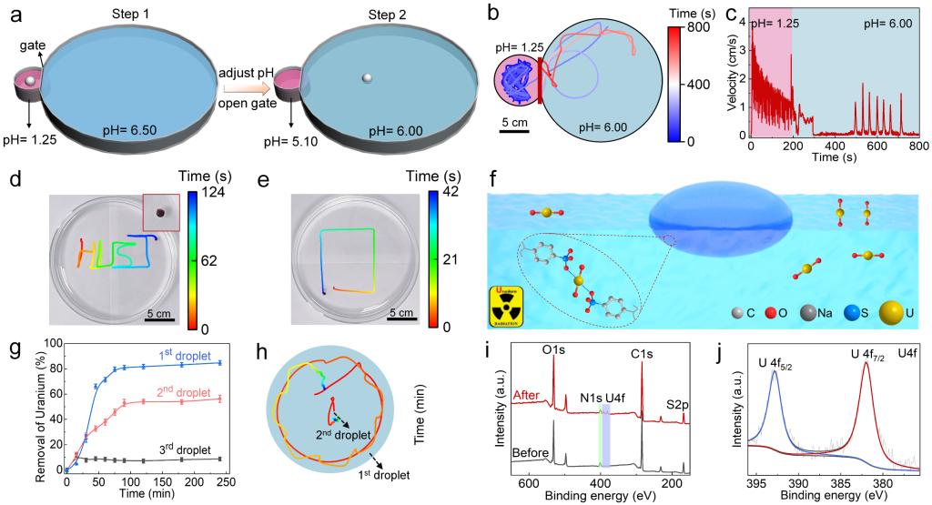 基于磺酸-鈾酰配位,液滴微馬達(dá)可以作為先進(jìn)的“清潔機(jī)器人”,從水中去除放射性鈾元素(圖6f)。液滴首先在pH=1.25的酸性水溶液中分別絡(luò)合3分鐘、10分鐘和6小時(shí),然后轉(zhuǎn)移到10 ppm的鈾溶液中。第一個(gè)液滴(絡(luò)合3分鐘)去除動(dòng)力學(xué)最快,在90分鐘內(nèi)去除了84.7%的鈾,而第二個(gè)液滴(絡(luò)合10分鐘)和第三個(gè)液滴(絡(luò)合6小時(shí))在相同的時(shí)間內(nèi)去除了54.1%和8.7%的鈾(圖6g)。在運(yùn)動(dòng)的前20分鐘內(nèi),第1液滴的速度比第2液滴更快,探索的面積也更大,而第3液滴是靜止的。因此,自推進(jìn)運(yùn)動(dòng)有助于促進(jìn)液滴微馬達(dá)探索鈾酰離子沒(méi)有被吸附的區(qū)域。此外,液滴產(chǎn)生的流場(chǎng)通過(guò)打破鈾酰離子的被動(dòng)擴(kuò)散來(lái)促進(jìn)溶液的混合。因此,通過(guò)液滴游泳器的主動(dòng)運(yùn)動(dòng),大大提高了除鈾效率。