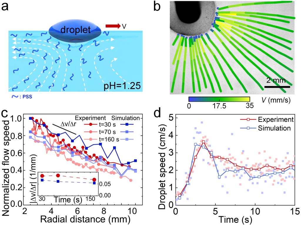液滴的自固化過(guò)程伴隨著PSS不斷向周圍水溶液釋放(圖3a),降低了液滴附近的表面張力,這反過(guò)來(lái)又在空氣-水界面誘導(dǎo)了長(zhǎng)程馬蘭戈尼流動(dòng)(圖3a,b)。由于液體的不可壓縮性,液滴產(chǎn)生的整體流場(chǎng)是三維的(圖3a)。當(dāng)用針將液滴固定在空氣-水界面上使其充當(dāng)“泵”時(shí),液滴在空氣-水界面處的液體流速隨著徑向距離的增加呈線性衰減。這與基于二維模型的模擬結(jié)果一致(圖3c,d)。