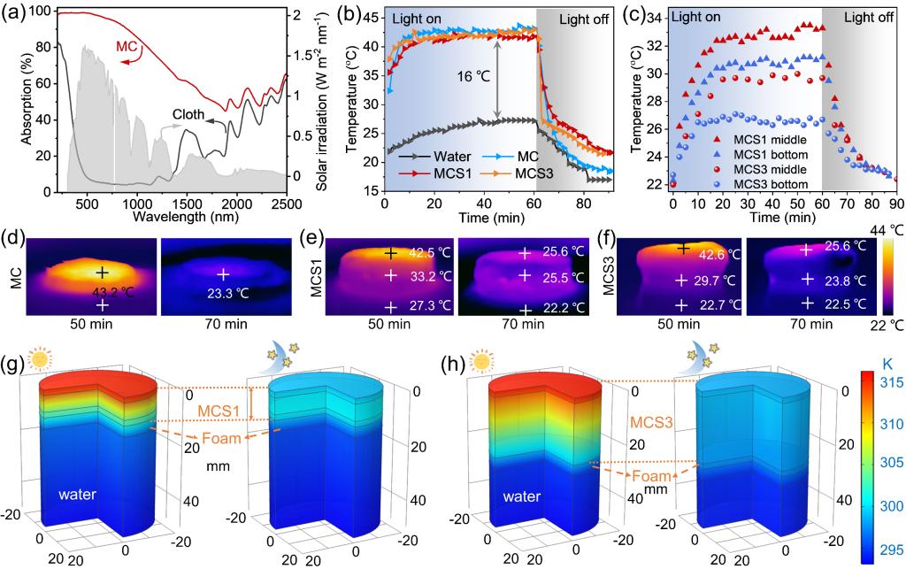 圖3 (a) MC和棉布的UV-vis-NIR吸收曲線; (b)樣品在1 kW m-2光照和關(guān)燈模式下的表面溫度曲線; (c)在1 kW m-2光照或關(guān)燈模式下MCS1和MCS3的中間和底部溫度曲線; (d) MC、(e) MCS1和(f) MCS3溫度分布的紅外圖像; COMSOL模擬(g) MCS1和(h) MCS3蒸發(fā)裝置在太陽光照(1 kW m-2)或關(guān)燈模式下溫度分布