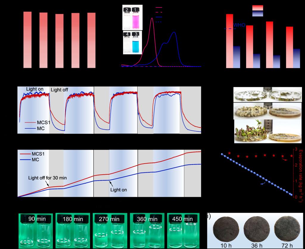 圖5 (a) MCS1在不同水源中的蒸發(fā)速率(太陽能強(qiáng)度 1 kW m-2); (b) 染料水和冷凝淡水的紫外-可見吸收光譜; (c) 海水和冷凝淡水中主要金屬離子的濃度; (d) 綠豆在冷凝水(左)或海水(右)中生長的照片; 在1 kW m-2的開關(guān)燈循環(huán)實(shí)驗(yàn)中,蒸發(fā)器的(e) 表面溫度,(f) 產(chǎn)水質(zhì)量變化以及(g) 產(chǎn)生淡水的實(shí)物照片; (h) MCS1在8小時內(nèi)蒸發(fā)性能的長期穩(wěn)定性; (i) 在連續(xù)水蒸發(fā)下MCS1表面的鹽沉積照片