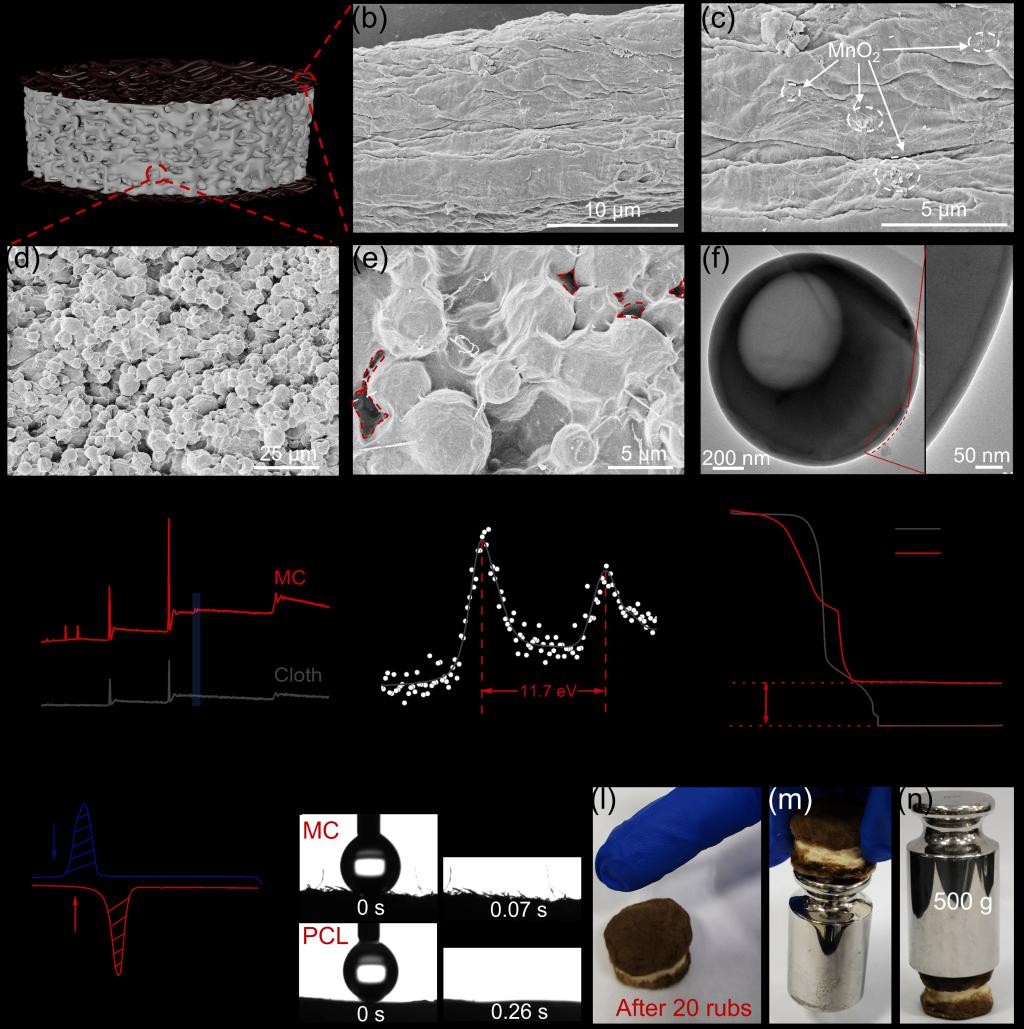 圖2 (a) MCSX蒸發(fā)器的示意圖; (b和c) MC膜和(d和e) PCL層的SEM圖像; (e) 中的紅色虛線標(biāo)記微膠囊之間的間距; (f) 微膠囊的TEM圖像; (g) MC和棉布的XPS總譜; (h) MC的特征Mn 2p XPS譜圖; (i)MC和棉布在空氣中的TGA曲線; (j) 相變微膠囊的DSC曲線; (k) MC和PCL的水接觸角; 照片顯示MCS1蒸發(fā)器的(l) 抗摩擦能力,(m) 不同層之間的強(qiáng)附著力,以及(n) 壓縮性能