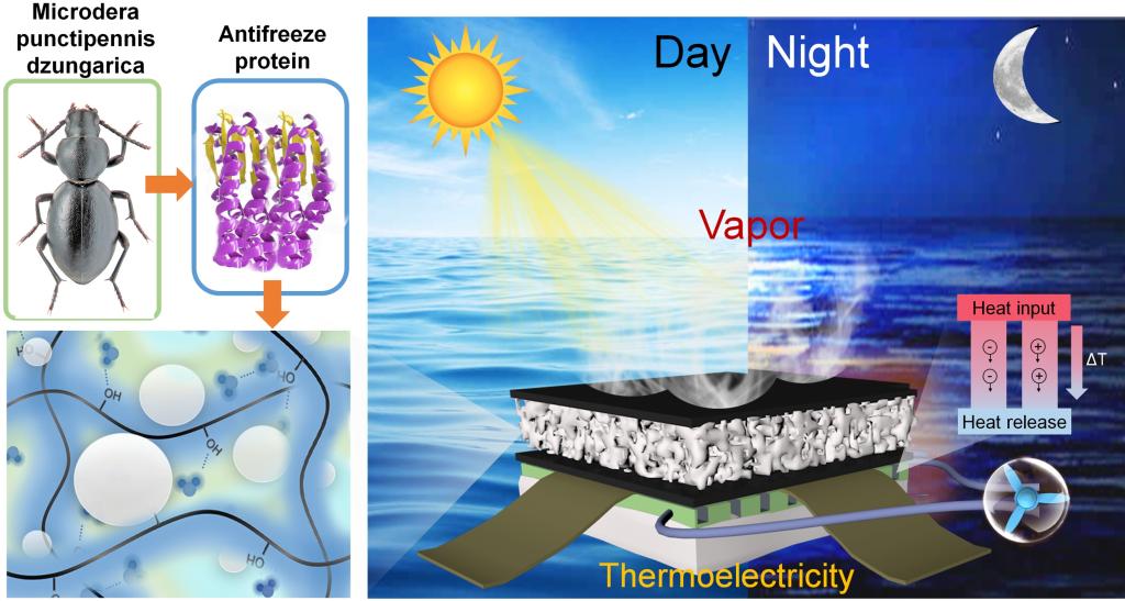 圖1受防凍蛋白啟發(fā)的MnO2基全天候太陽能蒸發(fā)器用于產(chǎn)水和發(fā)電的示意圖