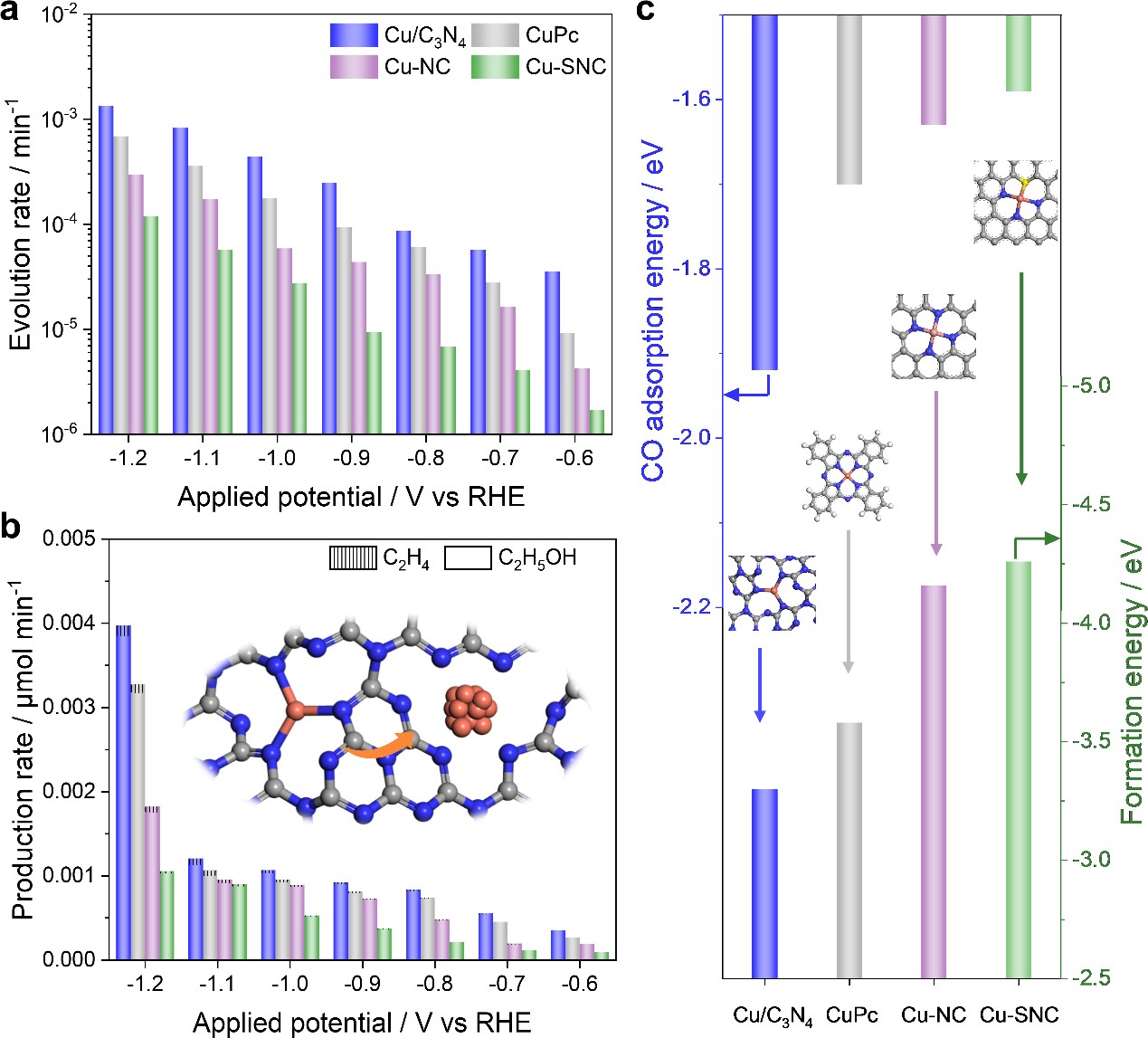 基于此,楊旋教授團(tuán)隊(duì)創(chuàng)新性地利用原位ATR-SEIRAS技術(shù)定量監(jiān)測四種銅單原子催化劑(Cu/C3N4、CuPc、Cu-NC和Cu-SNC)在CO2RR中的結(jié)構(gòu)演變。原位光譜結(jié)果表明,單原子Cu位點(diǎn)向金屬Cu納米顆粒的演變速率高度依賴于施加的電位,并且隨著電位變負(fù),其演變速率加快,在?1.2 V(所有的電位都是相對于可逆氫電極)下,形成金屬Cu顆粒的速率相比于?0.6 V時(shí)高近兩個(gè)數(shù)量級。活性結(jié)果表明,單原子Cu位點(diǎn)是CO2轉(zhuǎn)化為CO的活性點(diǎn),重構(gòu)生成的金屬Cu位點(diǎn)是CO2轉(zhuǎn)化為C2+產(chǎn)物的活性位點(diǎn)。DFT計(jì)算結(jié)果進(jìn)一步表明,銅單原子催化劑(Cu SACs)的穩(wěn)定性取決于Cu-X(X為C、N和S等)的形成能,即Cu SACs的穩(wěn)定性與Cu位點(diǎn)和催化劑基底的親和力緊密相關(guān),親和力越強(qiáng),穩(wěn)定性越高,控制Cu位點(diǎn)的配位數(shù)以及Cu位點(diǎn)和基底的相互作用能夠調(diào)控Cu SACs的穩(wěn)定性。本工作為深入理解Cu SACs的結(jié)構(gòu)-穩(wěn)定性關(guān)系提供了一種新穎的方法,為理性設(shè)計(jì)和合成高穩(wěn)定SACs提供了理論指導(dǎo)。
