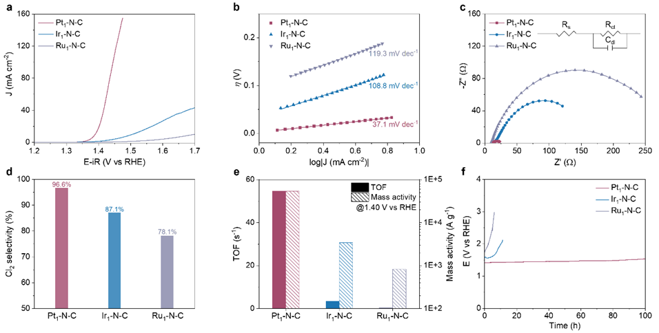 圖3. Pt1–N–C, Ir1–N–C, 和Ru1–N–C的CER性能