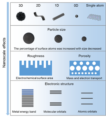 目前在異相電催化劑的合成過程中,納米尺度效應(yīng)(尺寸和形貌)已被廣泛研究。這些在納米和原子水平上的合成方法確保了原子的高利用效率、活性位點的優(yōu)化配置和電催化劑的特定選擇性,從而顯著提高了它們的電催化性能。