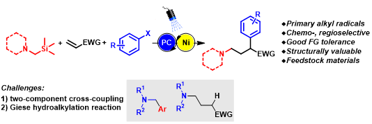 鎳/可見光氧化還原催化的烯烴的1,2-雙碳官能團(tuán)化反應(yīng)近年來得到了快速的關(guān)注(Chem. Sci. 2020, 11, 4051),該反應(yīng)可以避免使用有機(jī)金屬試劑,取而代之的是使用廉價(jià)易得、溫和的烷基自由基前體作為碳親核試劑端,同時(shí)可見光的介入使得反應(yīng)條件十分溫和,從而提高了該類反應(yīng)的底物普適性、官能團(tuán)兼容性以及原子和步驟經(jīng)濟(jì)性。此外,相比于傳統(tǒng)的過渡金屬催化烯烴的雙碳化反應(yīng),金屬/可見光組合催化策略通過單電子氧化親核試劑端生成烷基自由基啟動反應(yīng),從而導(dǎo)致反應(yīng)的區(qū)域選擇性發(fā)生完全翻轉(zhuǎn)。最近,Chu,Nevado,Molander和Aggarwal課題組分別報(bào)道了烯烴與芳基鹵化物和各類烷基自由基前體的三組分交叉偶聯(lián)反應(yīng)。但是,這類反應(yīng)都局限于二級和三級烷基自由基,而一級烷基自由基由于立體位阻小,活性高很容易直接與芳基鹵化物發(fā)生兩組分偶聯(lián)競爭反應(yīng),從而很難被應(yīng)用于烯烴的共軛加成、偶聯(lián)三組分串聯(lián)反應(yīng)中。