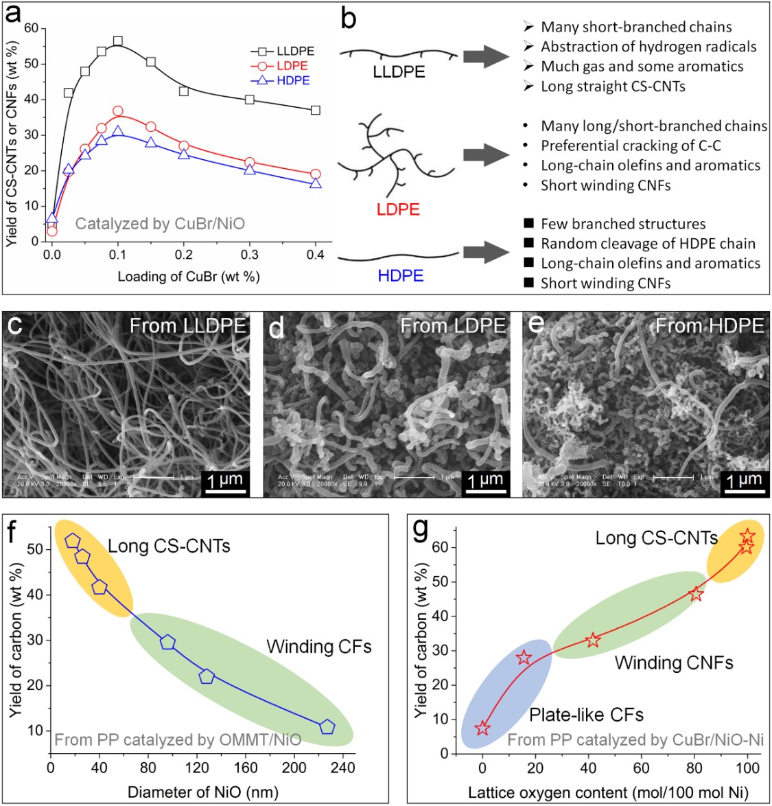 圖4組合催化碳化中,聚合物組成與分子鏈結(jié)構(gòu)、催化劑的尺寸和種類、晶格氧等對聚合物碳化反應(yīng)的影響(參考文獻:Angew. Chem. Int. Ed.2005,44, 1517;Chem. Mater.2005,17, 2799;Chem. Eur. J.2007,13, 3234;Carbon2007,45, 449;Polymer2009,50, 6252;J. Phys. Chem. C2010,114, 13226;Appl. Catal. B: Environ.2012,117-118, 185;Appl. Catal. B: Environ.2014,147, 592;Compos. Sci. Technol.2018,164, 82)