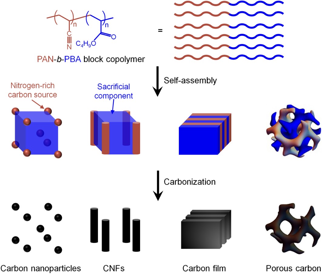 圖3Krzysztof Matyjaszewski教授課題組提出的共聚物模板碳化法實現(xiàn)聚丙烯腈(PAN)可控碳化制備碳材料(參考文獻:J. Am. Chem. Soc.2002,124, 10632;J. Am. Chem. Soc.2005,127, 6918;Angew. Chem. Int. Ed.2014,53, 3957;Macromolecules2017,50,2759;Prog. Polym. Sci.2019,92, 89;Adv. Mater.2019,31, 1804626)