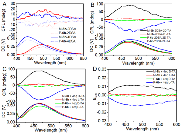 Fig. 2. 位阻型TPE四胺6b對(duì)映體與十二烷基苯磺酸DSA以及酒石酸TA混合物的CPL光譜。溶劑DCE,濃度[6b] = 2.0 x 10^-3 M.