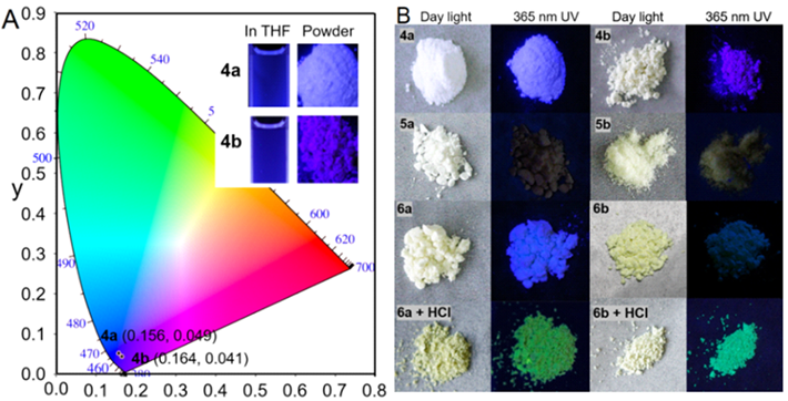 深藍(lán)色發(fā)光在顯示、照明中不可或缺,但深藍(lán)色發(fā)光化合物穩(wěn)定性差、熒光量子產(chǎn)率低,非常難得,因此開(kāi)發(fā)新型深藍(lán)色發(fā)光化合物具有重要意義。由于在苯環(huán)2,6位兩個(gè)甲基的位阻,使苯環(huán)與雙鍵共軛減小,使位阻型TPE螺旋體發(fā)射波長(zhǎng)變短,能夠發(fā)射427 nm至389 nm波長(zhǎng)范圍的深藍(lán)色和紫色熒光,其中4a和4b的CIE色度圖表明其色度坐標(biāo)CIEx,y分別為 (0.16, 0.049)和(0.16, 0.041),具有非常好的深藍(lán)色熒光,其熒光量子產(chǎn)率為17%-38%,因此這類熒光化合物有可能成為性能優(yōu)異的深藍(lán)色發(fā)光材料。
