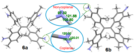 由于氨基上孤對(duì)電子與周圍成鍵電子的排斥力,孤對(duì)電子會(huì)把氮原子生成的三個(gè)共價(jià)鍵擠壓在一起,使氨、氨基及胺呈現(xiàn)錐形結(jié)構(gòu)。即使氨基的孤對(duì)電子與苯環(huán)共軛,仍然是錐形結(jié)構(gòu),只不過(guò)其錐形有所拉平,氮原子仍然是sp3雜化,這是所有有機(jī)化學(xué)和無(wú)機(jī)化學(xué)教科書(shū)中所介紹的基本知識(shí)。該課題組為了得到性能優(yōu)異的手性熒光分子,利用2,6-位二甲基取代的二苯基乙烯酮經(jīng)光分解偶合得到了構(gòu)象完全固定的位阻型TPE螺旋體,經(jīng)反應(yīng)條件優(yōu)化,偶合產(chǎn)率從19%提高到50%以上,苯環(huán)容易修飾,并拆分出對(duì)映體。晶體結(jié)構(gòu)測(cè)試發(fā)現(xiàn),TPE四胺螺旋體6a的氨基兩個(gè)氫原子與苯環(huán)處在同一個(gè)平面,氨基三個(gè)鍵之間的夾角都為120o, 因此氨基是一個(gè)氮原子為sp2雜化的平面結(jié)構(gòu),這是首次發(fā)現(xiàn)氨基具有平面結(jié)構(gòu)。然而,6b的氨基是正常的錐形構(gòu)象。6a氨基的平面結(jié)構(gòu)表明其孤對(duì)電子與苯環(huán)完全共軛,在固態(tài)下不會(huì)有孤對(duì)電子用于分子間的光致電子轉(zhuǎn)移(PET)過(guò)程,使其表現(xiàn)出AIE現(xiàn)象;而6b的氨基孤對(duì)電子沒(méi)有完全與苯環(huán)共軛,剩余的孤對(duì)電子會(huì)進(jìn)行分子間PET過(guò)程,表現(xiàn)出與AIE相反的ACQ效應(yīng)。