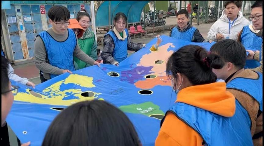 第二個項目是“環(huán)游世界球”,四隊分別通過抽簽兩兩開始,隊員們十人一組,所有人雙手拉住世界球地圖的邊緣,精神緊繃,互相配合,時刻擔心球會從地圖上的洞中掉下去。藍隊隊員齊心配合,默契十足,使球游走在七大洲四大洋之間,僅用十幾秒就取得了游戲的勝利。