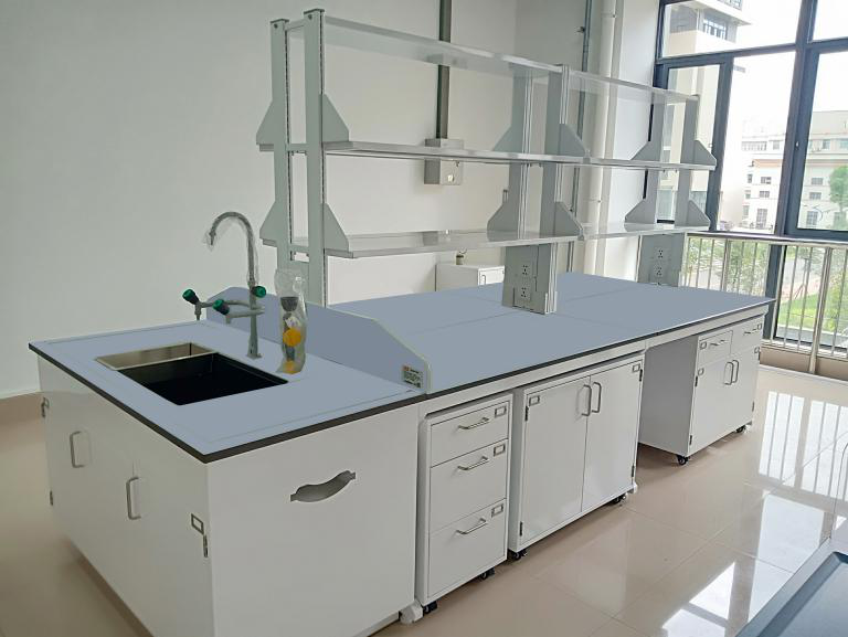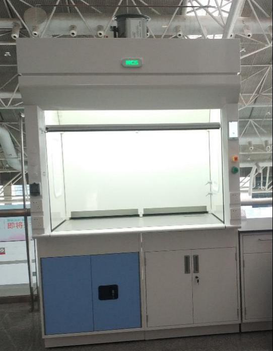 5、經(jīng)過改造工作小組討論,遵循少數(shù)服從多數(shù)的原則,最終選定實驗臺樣式為亞馬遜藍(lán)色陶瓷臺面配高光白色鋼架和鋼制柜體,鋼架采用2.0mm壁厚方管,鋼制柜體采用1.2mm鋼板,陶瓷臺面采用20mm厚,其中水槽臺面采用25mm厚一體成型阻水邊;全鋼通風(fēng)柜樣式為高光白柜體配班點灰顏色臺面,下柜為兩個獨(dú)立鋼柜,其中一個柜體為酸堿柜門板淺藍(lán)色,通風(fēng)柜上部內(nèi)部襯板和導(dǎo)流板頂板為白色陶瓷纖維板,酸堿柜內(nèi)部為白色陶瓷纖維板,臺面采用25mm厚一體成型阻水邊,陶瓷纖維板厚度為5mm。