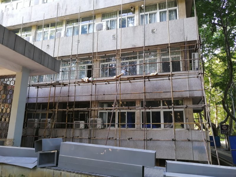 3、為解決化學(xué)樓主樓外墻空調(diào)冷凝水管安裝不規(guī)范,空調(diào)冷凝水滴到下層窗臺(tái),導(dǎo)致窗臺(tái)滲水、窗臺(tái)內(nèi)外墻脫皮的現(xiàn)象,學(xué)院計(jì)劃在暑期對(duì)化學(xué)樓主樓外墻防水進(jìn)行維修改造。主要對(duì)化學(xué)樓主樓空調(diào)冷凝管改外檐機(jī)械開(kāi)孔安裝、空調(diào)平臺(tái)上下防水粉刷、油漆翻新、空調(diào)污染處水刷石清洗等。8月6日,施工隊(duì)已開(kāi)始對(duì)外墻進(jìn)行搭建腳手架,近期開(kāi)始施工,爭(zhēng)取在學(xué)生開(kāi)學(xué)前完成施工。