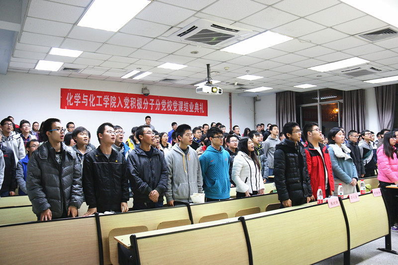 12月5日夜晚6:30,西十二樓S103教室里莊嚴(yán)的國(guó)歌聲驅(qū)走了寒意,迎來(lái)了化學(xué)與化工學(xué)院第21期入黨積極分子分黨校結(jié)業(yè)典禮。輔導(dǎo)員付冰冰老師,黨建工作組主任邵太康,13-14級(jí)聯(lián)合黨支部書記張明強(qiáng)以及黨建工作組各部門部長(zhǎng)出席本次典禮。