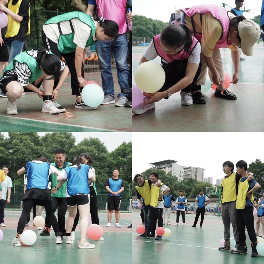 接下來的項目是“兩人三足踩氣球”。各隊商定好出戰(zhàn)陣容后,迅速在籃球場上進行了緊張快速的熱身。裁判一聲哨響,參賽隊員如餓虎撲食一般沖向?qū)κ郑揽烤o密配合,綠隊粉隊分別戰(zhàn)勝對手拿下積分。