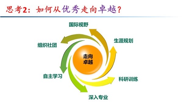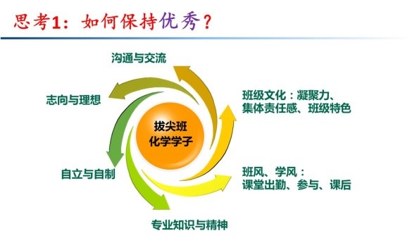 “到2020年,你希望你的腳步能走到哪里?”通過(guò)班會(huì)的討論和分享,每位拔尖班同學(xué)對(duì)這個(gè)問(wèn)題都開(kāi)始了自己的思考。針對(duì)這個(gè)問(wèn)題,班主任鐘老師在討論會(huì)的最后做了總結(jié)和一個(gè)簡(jiǎn)短的報(bào)告。鐘老師分析了我們16級(jí)拔尖班同學(xué)畢業(yè)后的可能選擇的職業(yè)道路,并以一個(gè)時(shí)間坐標(biāo)軸為圖,闡述了學(xué)術(shù)道路接下來(lái)十年將要行走的大概軌跡:2020年本科畢業(yè)、2025年左右博士畢業(yè),2029年前后在博士后科研經(jīng)歷后可以開(kāi)始獨(dú)立科研生涯。鐘老師還介紹了國(guó)外的Tenure track—“非升即走”制度。每個(gè)人成長(zhǎng)和成功的足跡都是不一樣的,但是選擇一個(gè)成功的榜樣是很有激勵(lì)作用的。鐘老師以國(guó)內(nèi)知名化學(xué)家為例解釋了國(guó)內(nèi)科研人員的學(xué)術(shù)發(fā)展之路,鼓勵(lì)同學(xué)們要樹(shù)立遠(yuǎn)大的志向,明確自己的定位和清晰的目標(biāo),并腳踏實(shí)地地去走。鐘老師以分析滴定實(shí)驗(yàn)為例,告訴大家不要急躁,要學(xué)會(huì)堅(jiān)守,正如“滴定管長(zhǎng)長(zhǎng)的,我們的未來(lái)長(zhǎng)長(zhǎng)的,堅(jiān)持用心地放入每一滴,終點(diǎn)就在你手中”這句話所言喻的一樣。