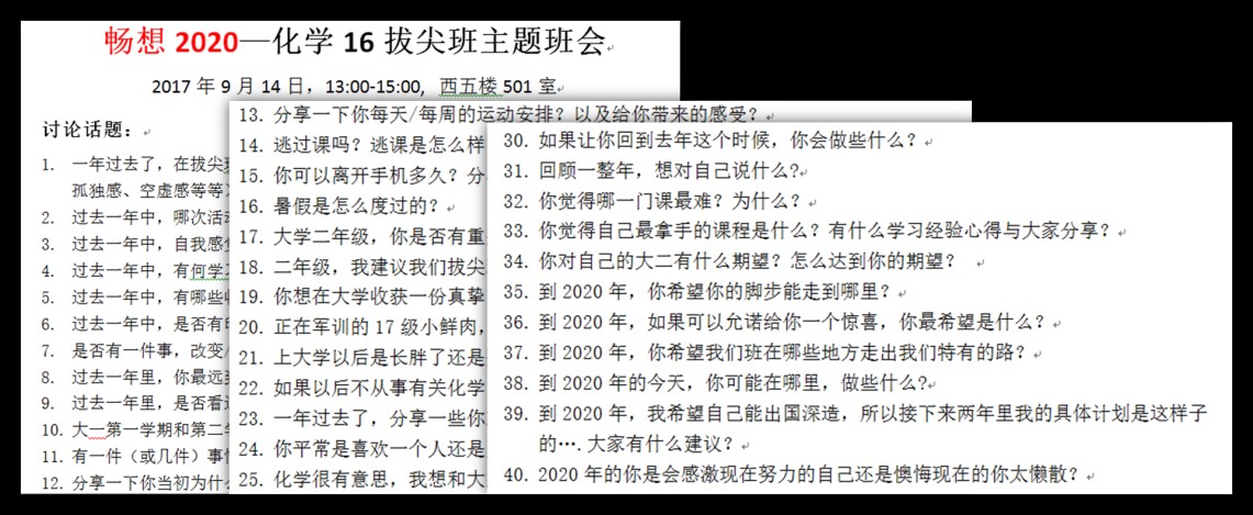 9月14日下午,一場(chǎng)以“暢想2020”為主題的別開(kāi)生面的班會(huì)在主校區(qū)西五501教室舉行,這是化學(xué)1601拔尖班自發(fā)組織召開(kāi)的系列主題班會(huì)之一。