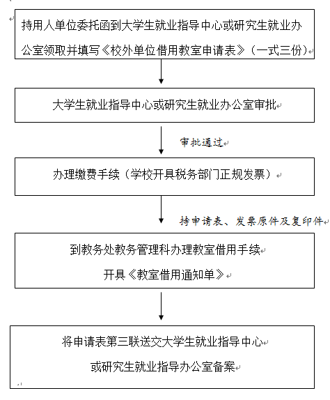 為保證校園招聘活動(dòng)和學(xué)校教學(xué)工作正常進(jìn)行,根據(jù)學(xué)校教務(wù)處《關(guān)于單位借用教室的管理規(guī)定》(校教〔2007〕52號(hào)),就用人單位借用學(xué)校教學(xué)樓教室開(kāi)展與畢業(yè)生招聘相關(guān)活動(dòng),規(guī)定如下: