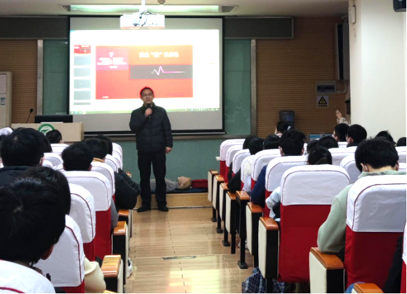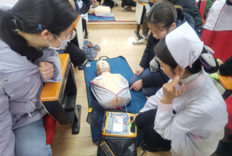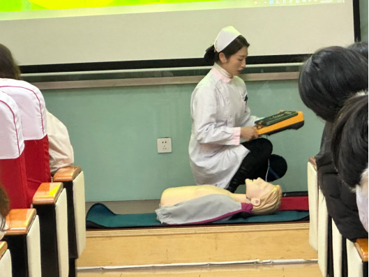 隨后,校醫(yī)院護士杜文麗向同學(xué)們講解了基礎(chǔ)的生命緊急事故急救方法,如心臟驟停、窒息、觸電等,并通過人體模型向在座師生展示了心肺復(fù)蘇、除顫儀和海姆立克急救法的具體操作。