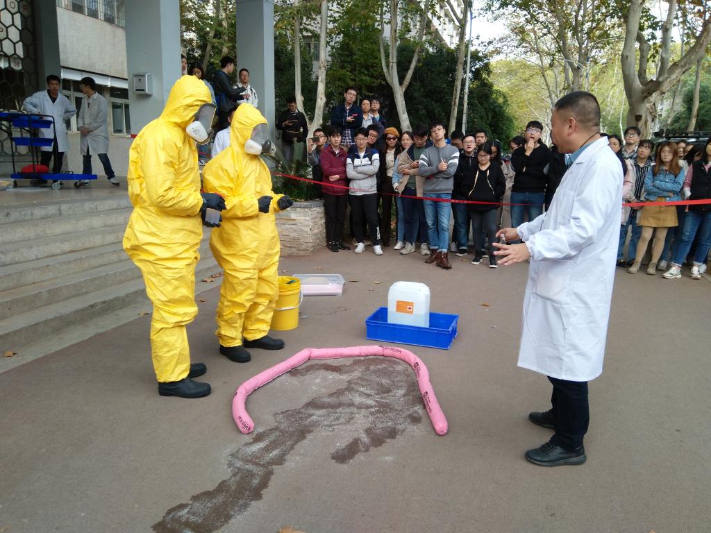 本次培訓(xùn)邀請了無錫賽弗安全裝備有限公司的專業(yè)培訓(xùn)師王龍生先生為師生們開展危險(xiǎn)化學(xué)品安全使用知識講座,并指導(dǎo)學(xué)生開展危險(xiǎn)化學(xué)品泄露事故應(yīng)急處置演練。王先生結(jié)合國內(nèi)危險(xiǎn)化學(xué)品事故的典型案例、高校危化品實(shí)驗(yàn)室的常見隱患,對危險(xiǎn)化學(xué)品的安全管理和安全使用知識進(jìn)行了細(xì)致的分析和講解。在應(yīng)急演練階段,他指導(dǎo)師生們模擬了實(shí)驗(yàn)中發(fā)生實(shí)驗(yàn)室廢液泄漏事故后,撤離現(xiàn)場、警戒疏散、根據(jù)危化品性質(zhì)開展救援以及化學(xué)廢棄物處理等應(yīng)急處置的全過程。通過演練,現(xiàn)場的師生掌握了應(yīng)急救援裝備的正確使用方法,對如何高效、規(guī)范處置危險(xiǎn)化學(xué)品泄露事故有了生動和全面的了解,有效提升了自救和互救能力。