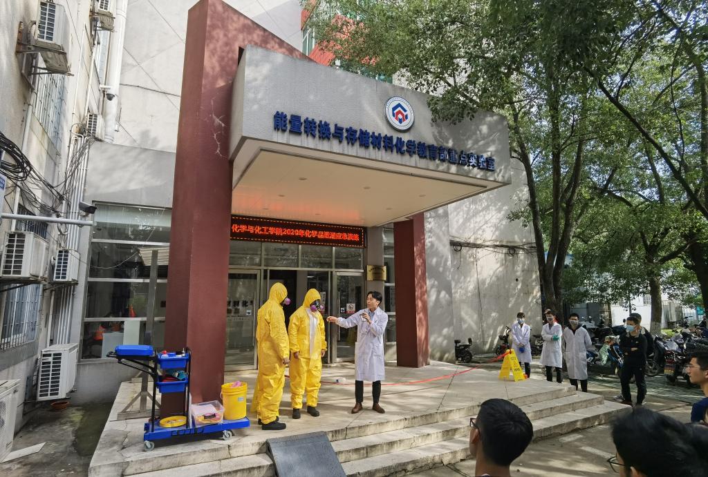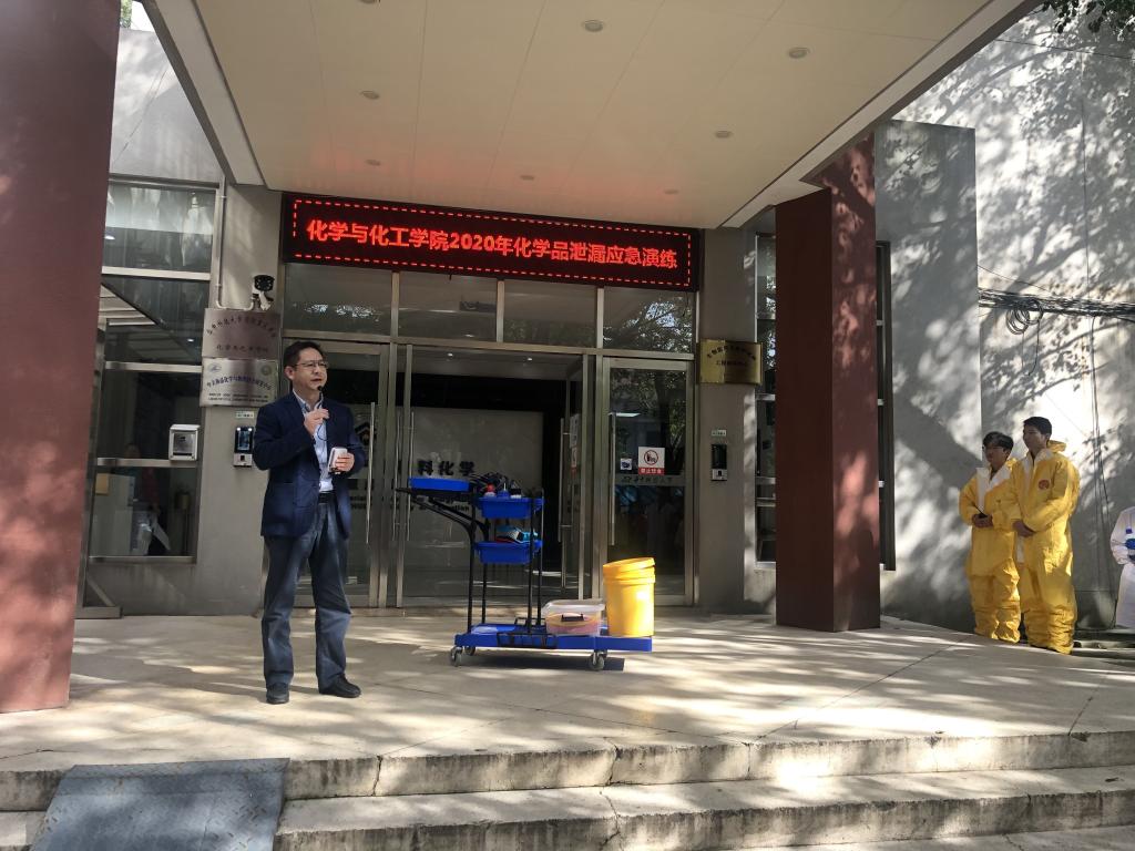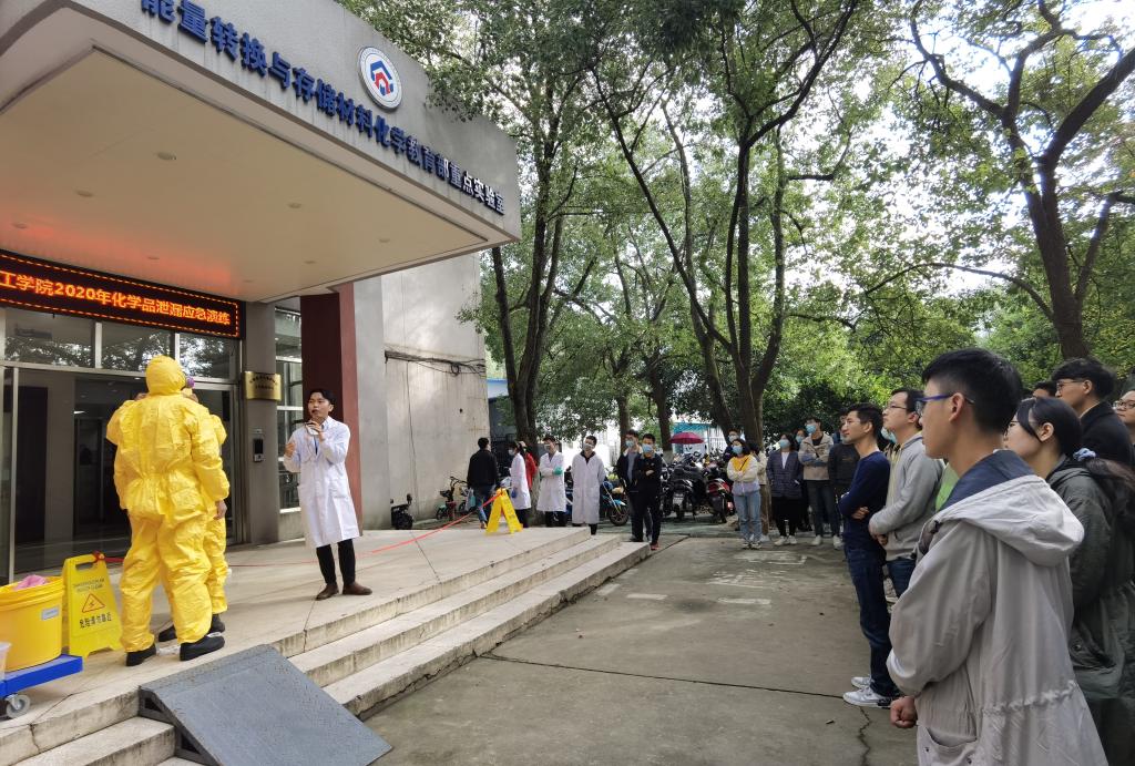 2020年10月21日下午14:30我院組織開展了化學(xué)品泄漏應(yīng)急演練,化學(xué)樓和韻苑實(shí)驗(yàn)樓約60名研究生參加了本次演練活動。實(shí)驗(yàn)室與設(shè)備管理處副處長毛勇杰、化學(xué)與化工學(xué)院副院長朱啟軍、以及安全科楊春華、吳敬老師參與指導(dǎo)本次活動。