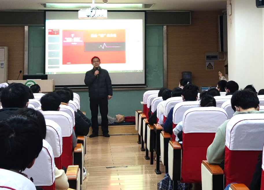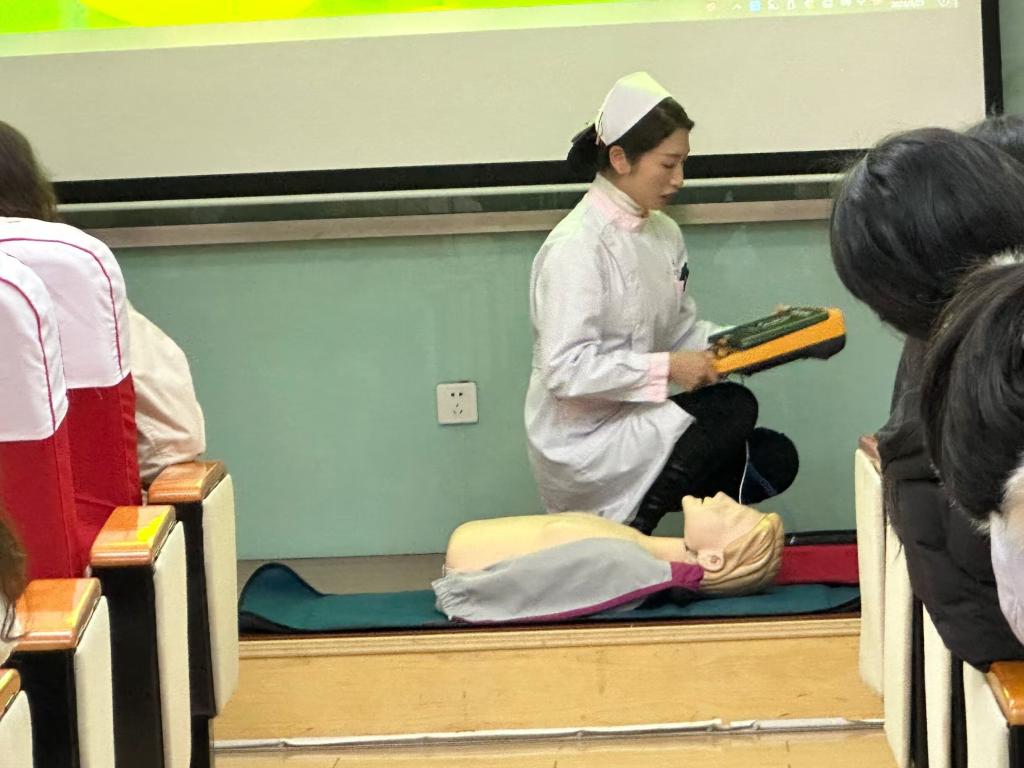 隨后,校醫(yī)院護(hù)士杜文麗向同學(xué)們講解了基礎(chǔ)的生命緊急事故急救方法,如心臟驟停、窒息、觸電等,并通過(guò)人體模型向在座師生展示了心肺復(fù)蘇、除顫儀和海姆立克急救法的具體操作。