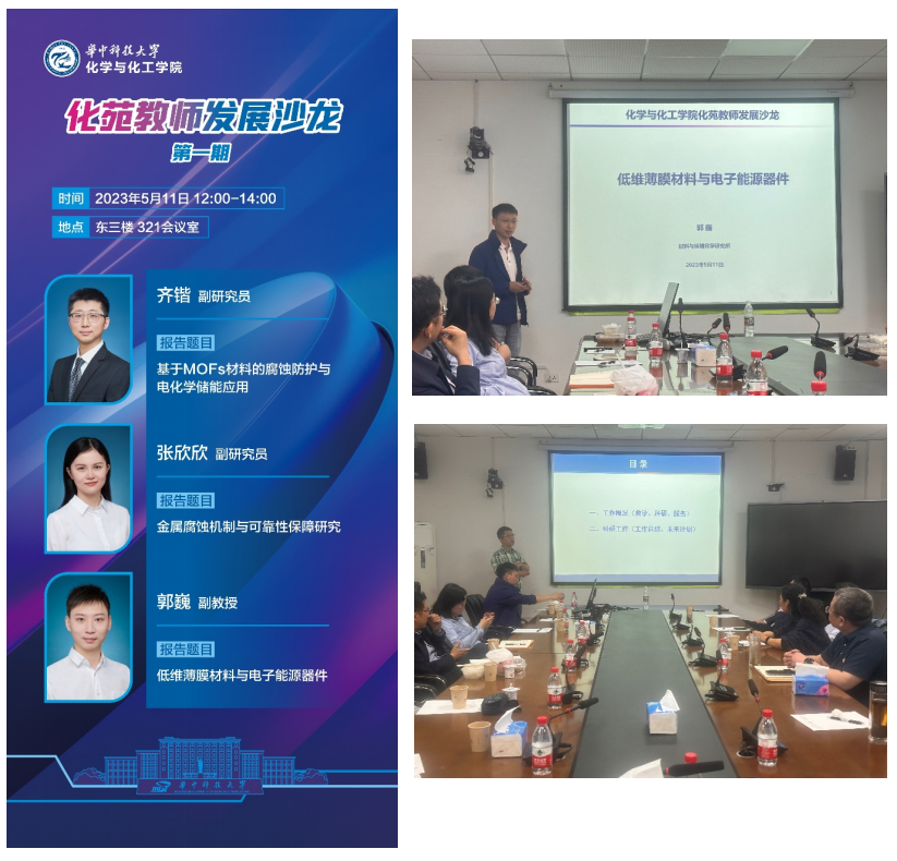 2023年5月11日,化苑青年教師發(fā)展沙龍第一期成功舉辦。青年教師郭巍副教授、齊凱副研究員進(jìn)行工作匯報,學(xué)院黨委書記江洪洋,院長譚必恩,副院長龔躍法、顧彥龍和部分教師參會,沙龍由院工會主席高中洪主持。