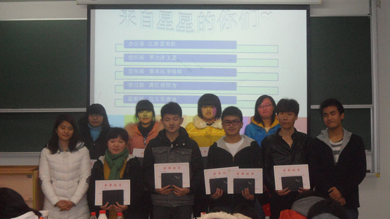 這次大會亦是榮譽的大會——大會上,來自辦公室的江濤、雷美玲等十名在上學期表現(xiàn)突出的同學都被授予了“部門之星”的稱號。石培主任與于汾秘書長為他們頒獎并合影留念。