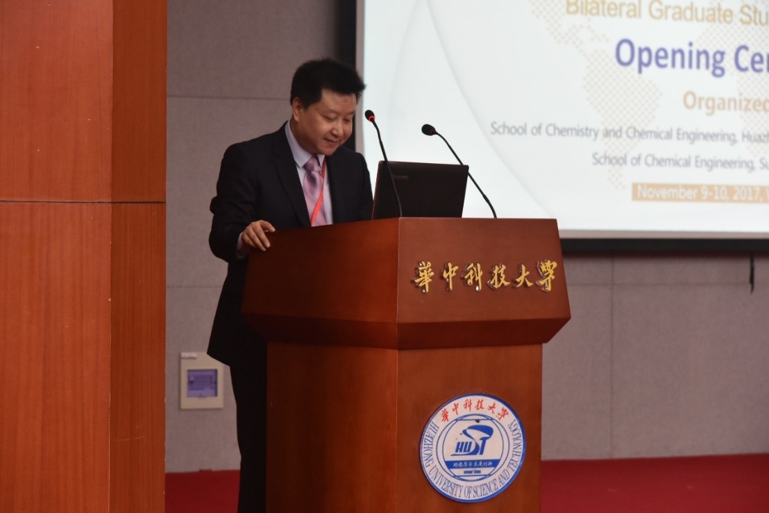 9日上午,華中科技大學(xué)研究生院院長(zhǎng)解孝林、外事處副處長(zhǎng)何剛、化學(xué)與化工學(xué)院黨委書記李濤、院長(zhǎng)朱錦濤等出席了開幕式,化學(xué)與化工學(xué)院的全體博士生、部分研究生和導(dǎo)師參加了會(huì)議。開幕式由化學(xué)與化工學(xué)院副院長(zhǎng)譚必恩教授主持。