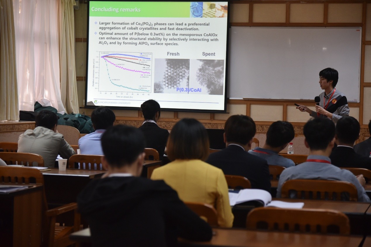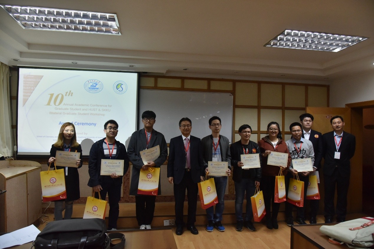 下午5時(shí)40分,英文分會(huì)場(chǎng)閉幕式在一號(hào)樓211會(huì)議室舉行,與此同時(shí),中文會(huì)場(chǎng)閉幕式在西十二教學(xué)樓S207舉行,主持人宣布結(jié)果并由中韓雙方領(lǐng)導(dǎo)頒獎(jiǎng)。韓方Kim教授和中方朱錦濤教授分別致辭并由學(xué)院領(lǐng)導(dǎo)為他們頒發(fā)了證書和獎(jiǎng)品。成均館大學(xué)Kim教授在隨后表達(dá)了對(duì)此次會(huì)議的贊賞,對(duì)為籌辦此次會(huì)議的化學(xué)與化工學(xué)院師生表示了衷心的感謝,他希望中韓學(xué)術(shù)交流繼續(xù)舉辦下去并越來越好。李濤教授在最后的致辭中也表示非常期待明年的學(xué)術(shù)論壇更好并衷心祝愿兩校往來友好。