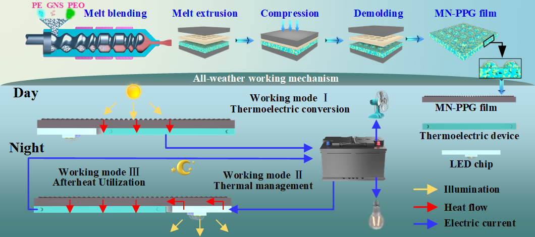 近日,華中科技大學瞿金平院士團隊提出了一種具有化學、潤濕和熱穩(wěn)定性的全天候能量捕獲與循環(huán)利用復合材料的制備方法(圖1),即微擠注壓縮成型,用于高效地制造具有太陽能熱發(fā)電、LED芯片熱管理和余熱利用的仿生PE/PEO/GNS復合材料(MN-PPG)。由于PEO和PE形成了共連續(xù)網(wǎng)絡結構,MN-PPG薄膜具有優(yōu)異的形狀穩(wěn)定性、高能量存儲密度和良好的熱管理能力。MN-PPG薄膜表面的仿生復眼微納結構賦予其優(yōu)異的陷光、超疏水、耐酸堿性、防冰和除冰性能,這意味著太陽能可以被更高效地轉化成熱量用于發(fā)電,同時提高了材料的戶外使用適應性。 此外,通過集成MN-PPG薄膜、LED芯片和熱電模塊,建立了多功能能量捕獲和循環(huán)系統(tǒng),3個太陽下系統(tǒng)的輸出功率和開路電壓分別為2.5 W m?2和315.4 mV。更重要的是,該系統(tǒng)不僅可以對夜間照明LED芯片進行熱管理,而且可以將其產(chǎn)生的余熱進一步轉換為電能,因此實現(xiàn)了全天候的能量捕獲與循環(huán)利用。這項工作打破了能量收集材料功能單一的局限性,為大規(guī)模制備適用于戶外環(huán)境的仿生能量收集材料提供了新的思路。相關工作以“Bioinspired Micro/Nanostructured Polyethylene/Poly(Ethylene Oxide)/Graphene Films with Robust Superhydrophobicity and Excellent Antireflectivity for Solar–Thermal Power Generation, Thermal Management, and Afterheat Utilization”為題發(fā)表在《ACS Nano》上。全文鏈接(https://pubs.acs.org/doi/10.1021/acsnano.2c06065)