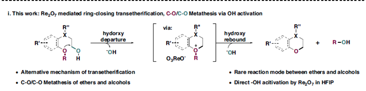 在傳統(tǒng)醇與醚的復(fù)分解反應(yīng)中,幾乎所有的反應(yīng)都是通過活化醚,隨后被醇羥基親核取代來實現(xiàn)的,凈結(jié)果是一個C-O/O-H σ-鍵的交叉復(fù)分解反應(yīng)。在謝有偉團隊報道的這篇論文中,實現(xiàn)了Re2O7催化的醇與醚之間的C-O/C-O σ-鍵復(fù)分解反應(yīng),該反應(yīng)通過Re2O7活化醇羥基從而促進醚的親核取代來實現(xiàn)分子內(nèi)C-O/C-O關(guān)環(huán)復(fù)分解,合成相應(yīng)的含氧雜環(huán)化合物。這是一個分子內(nèi)轉(zhuǎn)醚化反應(yīng),將苯甲醚衍生物轉(zhuǎn)化成苯并含氧雜環(huán)化合物(五、六、七元雜環(huán))和甲醇。通過相應(yīng)的機理實驗和DFT理論計算,驗證了該反應(yīng)最可能的機理,這與之前報道的這類反應(yīng)的機理完全不同。
