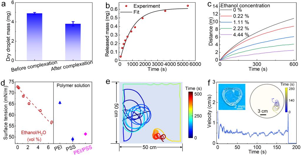 PEI/PSS液滴在固化的同時(shí)向水溶液中緩慢釋放微量的PSS 和PEI分子,其中PSS可以降低水的表面張力,從而產(chǎn)生表面張力梯度。將PEI/PSS液滴置于pH為1.25的水中1.5小時(shí)后,液滴的總質(zhì)量損失為22.1 wt%(圖2a),其中,PSS的釋放率隨時(shí)間降低,最終趨于平穩(wěn)(圖2b)。此外,隨著酸性水中乙醇濃度的增加,液滴的平均速度和總移動(dòng)距離都會(huì)減小(圖2c)。這是因?yàn)橐掖嫉募尤虢档土怂嵝运谋砻鎻埩?圖2d)。進(jìn)一步,作者探討了邊界對(duì)液滴運(yùn)動(dòng)的影響。在方形容器中的結(jié)果(圖2e)與圓形容器(R=10 cm)類似(圖1b),液滴首先向方形容器的邊界移動(dòng),并在沿著邊界的路徑中獲得手性運(yùn)動(dòng)軌跡。這些觀察結(jié)果表明,液滴馬達(dá)的手性自推進(jìn)不需要受限邊界。然而,在強(qiáng)一維約束下(~ 7倍液滴直徑),液滴將沿著通道進(jìn)行定向運(yùn)動(dòng),而不發(fā)生手性運(yùn)動(dòng)。
