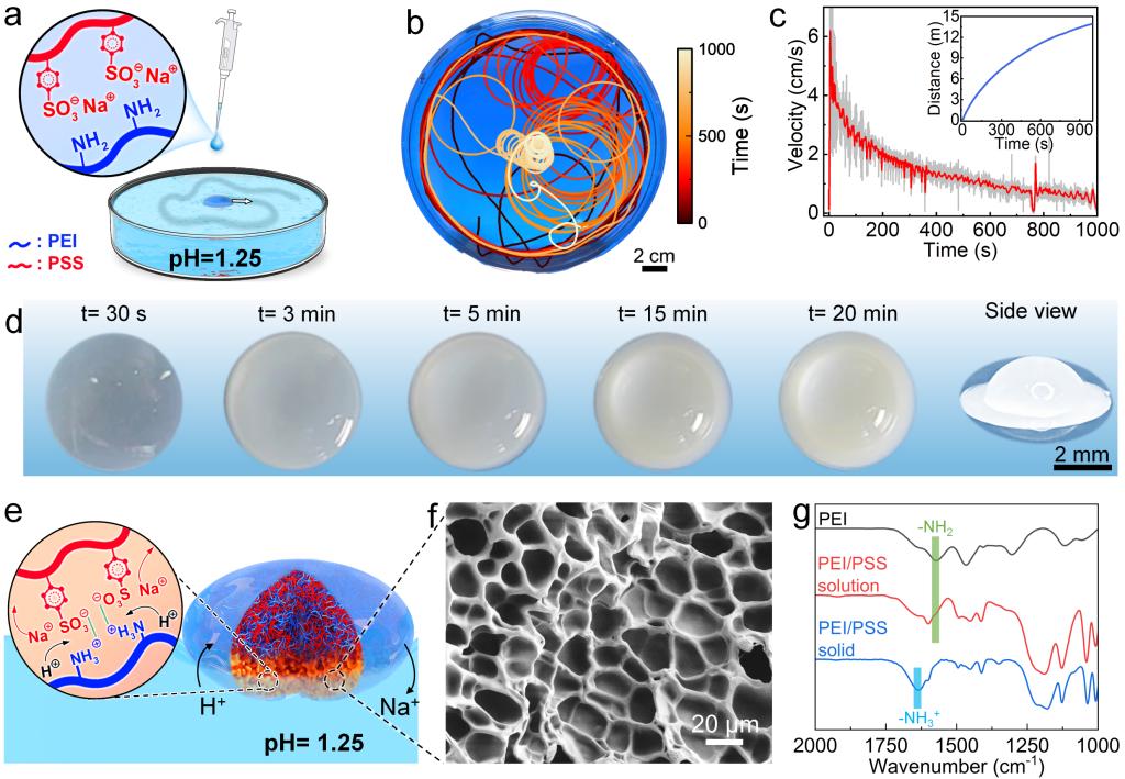 聚乙烯亞胺(PEI)和聚苯乙烯磺酸鈉(PSS)水溶液(25 wt%)的pH值為13左右,此時(shí),胺基的質(zhì)子化和PEI/PSS的絡(luò)合作用很弱,PEI/PSS可以形成均勻溶液。而將PEI/PSS溶液(20 μL)滴在酸性水溶液(pH=1.25,圖1a)上時(shí),令人驚訝的是,PEI/PSS液滴并沒(méi)有溶解,而是自發(fā)地在水-空氣界面移動(dòng)(圖1b)。在自主推進(jìn)過(guò)程中,PEI/PSS游泳者逐漸由透明變?yōu)椴煌该鳎纬深愃芔FO的形狀(圖1d)。這種相轉(zhuǎn)變過(guò)程是PEI/PSS絡(luò)合導(dǎo)致的。由于周圍的水溶液呈酸性,質(zhì)子通過(guò)液滴界面擴(kuò)散到液滴內(nèi),觸發(fā)PEI/PSS絡(luò)合(圖1e),并形成了一個(gè)薄的固體邊界(圖1f),最終會(huì)導(dǎo)致完全固化。FTIR證實(shí)了絡(luò)合物中質(zhì)子化氨基的存在。