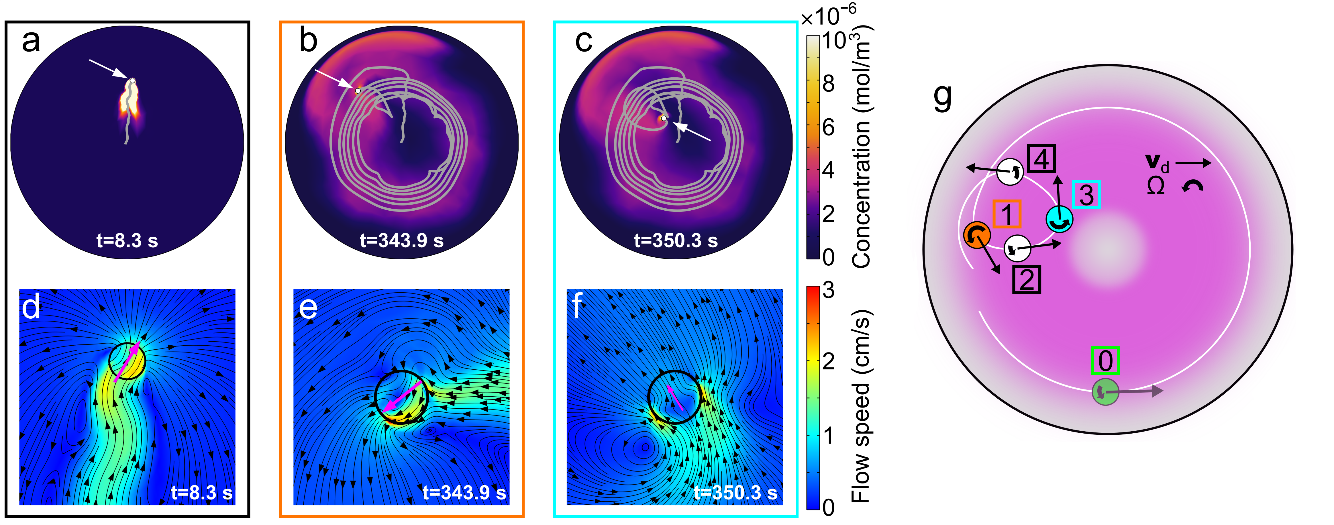 作者通過(guò)模擬驗(yàn)證了自固化液滴馬達(dá)從彈道運(yùn)動(dòng)到手性主動(dòng)運(yùn)動(dòng)的轉(zhuǎn)變是由液滴與殘留PSS軌跡相互作用引起的。最初,液滴自驅(qū)動(dòng)主要取決于液滴釋放的PSS產(chǎn)生的馬蘭戈尼流動(dòng)。然而,在后期,隨著液滴釋放PSS速率的減弱,“舊的”P(pán)SS濃度起著越來(lái)越重要的作用,特別是在環(huán)形區(qū)域的邊緣(圖5b,c,紅色區(qū)域)。當(dāng)液滴從內(nèi)部靠近這些區(qū)域時(shí),整體流動(dòng)(包括“舊的”和“新的”P(pán)SS的貢獻(xiàn))使液滴回到環(huán)形區(qū)域。這導(dǎo)致了液滴在環(huán)內(nèi)的手性運(yùn)動(dòng),環(huán)的寬度決定了手性運(yùn)動(dòng)軌跡的半徑(圖5b,c)。