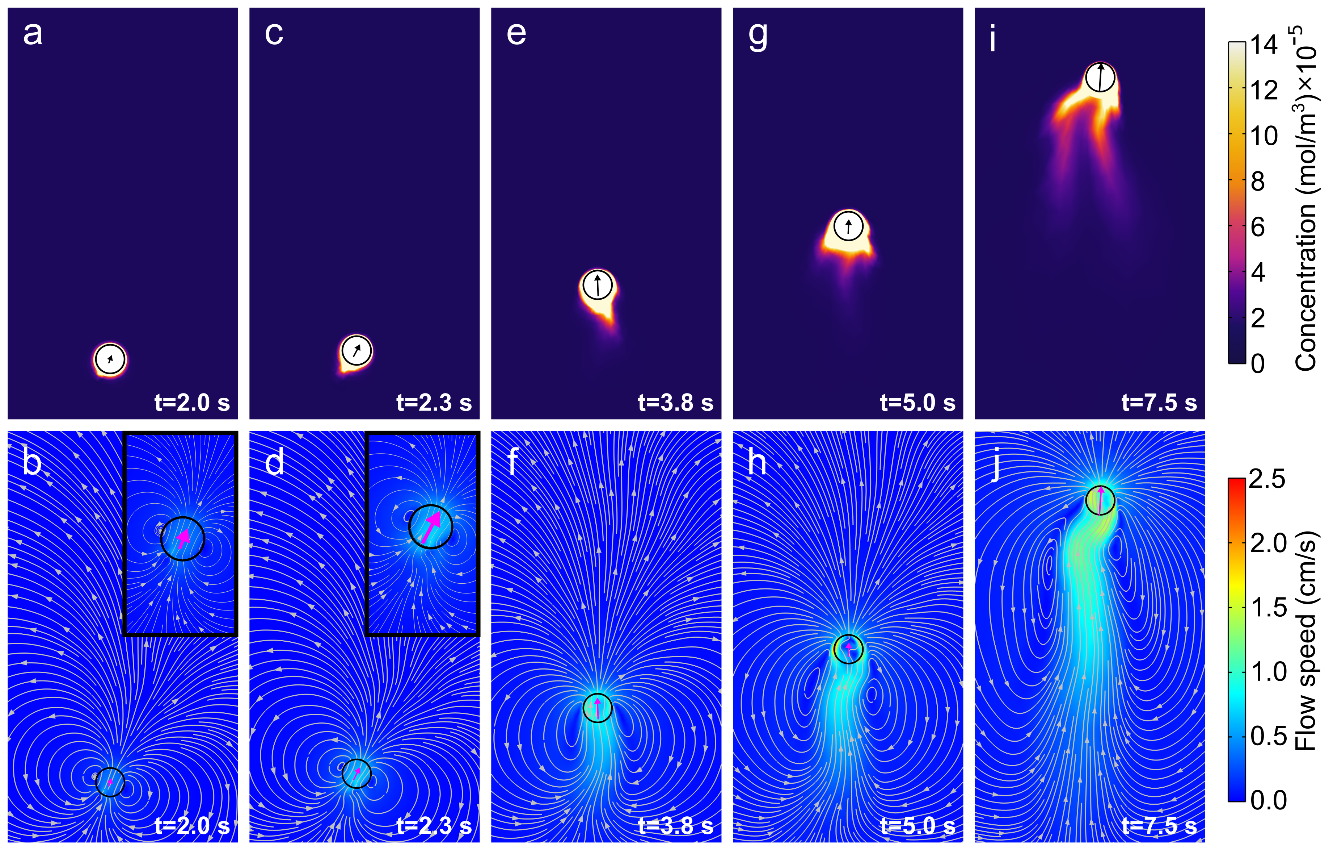 通過(guò)2D模型,作者模擬了液滴釋放PSS并建立表面張力梯度的過(guò)程。最開(kāi)始,由于液滴和周圍流場(chǎng)的對(duì)稱性,液滴并不能運(yùn)動(dòng)。然而,在高Pe數(shù)下,對(duì)稱性的微小自發(fā)破壞導(dǎo)致PSS分布和液滴動(dòng)力學(xué)的正反饋循環(huán),即PSS分布的自發(fā)擾動(dòng)導(dǎo)致馬蘭格尼流場(chǎng)的微小不對(duì)稱,從而在液滴上施加一個(gè)弱的有效作用力。該力的方向指向低PSS濃度區(qū)。隨著液滴向遠(yuǎn)離高PSS區(qū)的方向運(yùn)動(dòng),PSS分布以及馬蘭格尼流場(chǎng)的不對(duì)稱性進(jìn)一步加劇,進(jìn)而導(dǎo)致有效作用力的增加。這種正反饋循環(huán)使液滴的運(yùn)動(dòng)速度增加,直到達(dá)到一個(gè)飽和值。