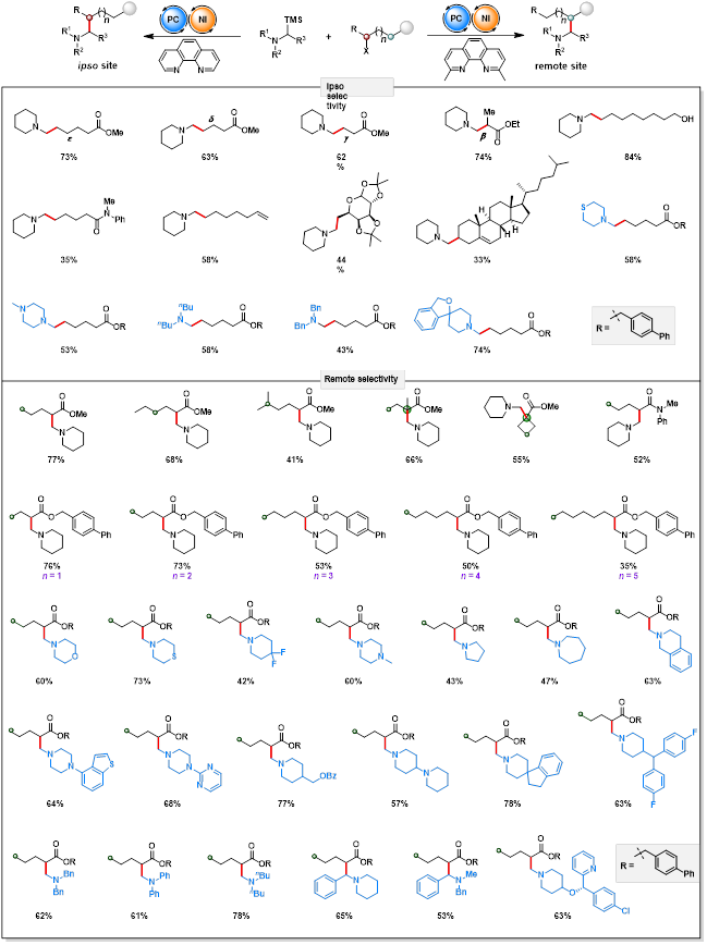 圖一. 鎳/可見光協(xié)同催化未活化烷基鹵代物的區(qū)域發(fā)散性氨烷基化