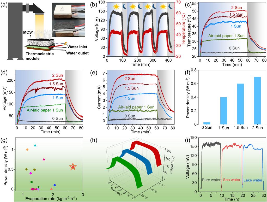 圖6 (a) 用于水電聯(lián)產(chǎn)的裝置示意圖; (b) 在1 kW m-2光照下,裝置的循環(huán)光響應(yīng)曲線; 裝置在開燈和關(guān)燈模式的(c)表面溫度、(d) 開路電壓和(e) 短路電流曲線; (f) 設(shè)備在不同強(qiáng)度太陽光照射下的功率密度; (g) 組裝裝置的發(fā)電性能與文獻(xiàn)進(jìn)行對比; (h) 在不同下表面溫度時,混合裝置的開路電壓; (i) 混合裝置在不同水質(zhì)中的耐用性(太陽能強(qiáng)度 1 kW m-2)