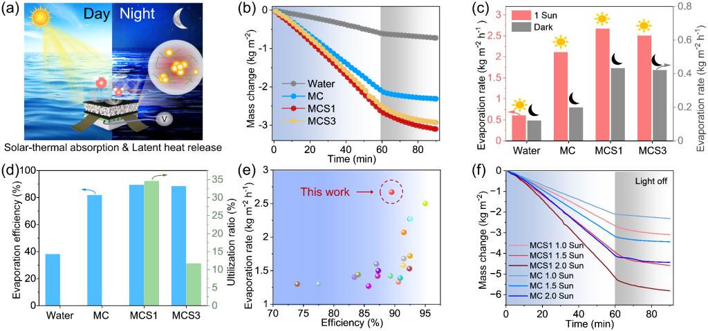 圖4 (a) 全天候太陽能界面蒸發(fā)和熱電發(fā)電示意圖; (b) 水的質(zhì)量變化和(c) 各種蒸發(fā)器在開燈或關(guān)燈模式下的蒸發(fā)速率; (d) 蒸發(fā)器在1 kW m-2太陽光照下的蒸發(fā)效率和相變微膠囊的利用率; (e) MCS1的蒸發(fā)性能與先前報(bào)道的太陽能蒸發(fā)器做比較; (f) MCS1和MC在不同太陽光照強(qiáng)度下生產(chǎn)淡水的質(zhì)量變化 (光照60分鐘,黑暗30分鐘)