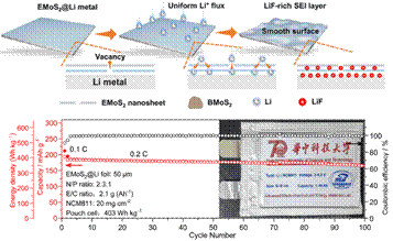 基于此,我院王得麗教授課題組采用簡單的壓印法以剝離的二硫化鉬納米片為單元在金屬鋰負(fù)極表面構(gòu)建了多功能人工SEI旨在解決金屬鋰電池中棘手的鋰離子不均勻沉積,鋰枝晶生長和N∕P高等問題。研究發(fā)現(xiàn)剝離的MoS2具有諸多優(yōu)勢(shì),例如含有大量硫空位和富1T相可以降低Li成核過電位,降低Li+傳輸能壘;而且剝離的MoS2具有很高的楊氏模量和優(yōu)異的離子導(dǎo)率,可以有效抑制Li枝晶的生長和SEI的不斷破裂/生成;良好的界面潤濕性和均勻的層狀結(jié)構(gòu)可以調(diào)控優(yōu)化鋰離子通量加快反應(yīng)動(dòng)力學(xué)。最終匹配高壓NCM811正極可以實(shí)現(xiàn)400 Wh kg?1的軟包全電池性能并穩(wěn)定循環(huán)100次。利用富硫空位和1T相超薄二硫化鉬納米片構(gòu)建人工SEI的策略為實(shí)現(xiàn)長循環(huán)穩(wěn)定性的高能量密度鋰金屬電池提供了新的指導(dǎo)。