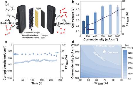 為解決這一問題,研究人員首先采用理論計(jì)算和分子動(dòng)力學(xué)模擬解析了催化劑在電化學(xué)條件下的重構(gòu)行為以及對(duì)乙烯選擇性影響的關(guān)鍵因素(圖一)。進(jìn)而根據(jù)催化劑的重構(gòu)行為和影響乙烯性能的關(guān)鍵因素,定向設(shè)計(jì)了一種能夠高效電催化二氧化碳還原為乙烯的銅基催化劑(TS-Cu)。得益于先進(jìn)催化劑的設(shè)計(jì),該銅催化劑能夠在-0.9 V vs RHE的電位下以800 mA cm-2的電流密度高效催化二氧化碳轉(zhuǎn)化為乙烯(法拉第效率大于70%)。此外,在膜電極系統(tǒng)中,該催化劑在3.5 V槽壓下實(shí)現(xiàn)了超過72%的法拉第效率和230 h的穩(wěn)定性(圖二)。最后,研究人員根據(jù)當(dāng)前原料成本估計(jì)了該催化劑的工業(yè)化前景,發(fā)現(xiàn)系統(tǒng)每電解產(chǎn)生1噸乙烯將獲得180美元的盈利(圖二),有望促進(jìn)二氧化碳電解技術(shù)工業(yè)化應(yīng)用。