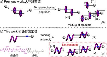 芳香酰胺折疊體為解決上述難題帶來了機(jī)遇。我們課題組設(shè)計(jì)、合成了一類折疊體與多肽共價(jià)連接的分子序列,由于折疊體與多肽間存在氫鍵作用,該分子能高效自組裝成[c2]雛菊鏈結(jié)構(gòu)。不同于以往的大環(huán)雛菊鏈,折疊體雛菊鏈?zhǔn)峭ㄟ^解螺旋-再纏繞的機(jī)制形成主客體復(fù)合物,不再需要封端反應(yīng)產(chǎn)生的不可逆機(jī)械互鎖形式。盡管這種絡(luò)合機(jī)制在動力學(xué)上可逆,但緩慢的解離速度使得該互穿體系足夠穩(wěn)定,為后續(xù)分子運(yùn)動調(diào)控提供了基礎(chǔ)。