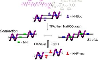 在此基礎(chǔ)上,我們將序列中多肽部分延長,使折疊體可以在多個(gè)識別作用位點(diǎn)間往返梭動,從而構(gòu)建了[c2]雛菊鏈型人工分子肌肉(圖2)。通過保護(hù)/去保護(hù)反應(yīng)調(diào)節(jié)識別位點(diǎn)的氨基,改變其空間位阻,可實(shí)現(xiàn)對分子肌肉拉伸/壓縮運(yùn)動狀態(tài)的調(diào)控。該研究為進(jìn)一步探索基于動態(tài)組裝的復(fù)雜分子體系奠定了基礎(chǔ)。