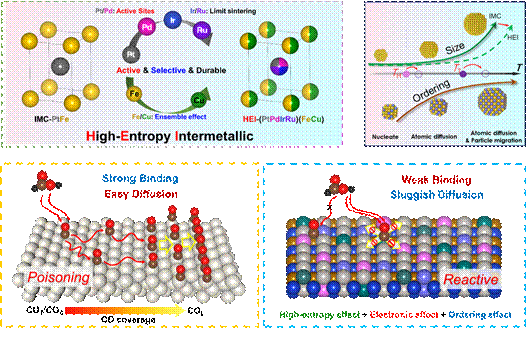 圖1. 超小高熵金屬間化合物設(shè)計策略與抗CO*毒化機(jī)制示意圖